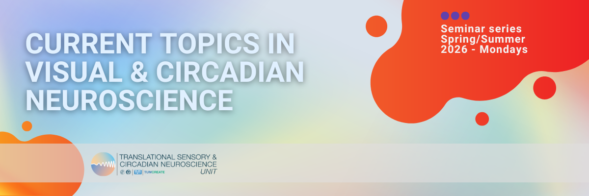 The Seminar Series "Current Topics in Visual & Circadian Neuroscience" is organised by the Translational Sensory & Circadian Neuroscience Unit (MPS/TUM/TUMCREATE)<https://www.tscnlab.org/> led by Prof. Dr. Manuel Spitschan. The 60-minute (45 min. talk + 15 min. Q&A/discussion) graduate-level seminars are free to join and take place via Zoom.
